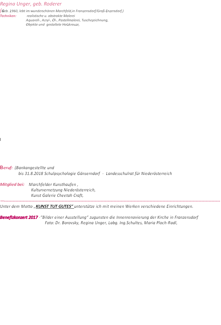 Bekannt unter dem Pseudonym UNGER-ART - ist mit ihren Wurzeln im Marchfeld in Franzensdorf beheimatet. Als langjährige Künstlerin hat sie ihre Fähigkeiten im Laufe der Zeit verfeinert und eine künstlerische Ausbildung bei in- und ausländischen Dozenten genossen.